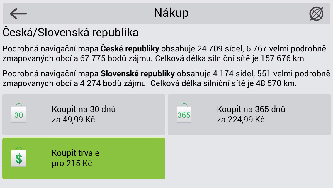 Pro nákup mapových balíčků z menu aplikace vyberte: Hlavní menu > Můj Navitel > Koupit mapy.