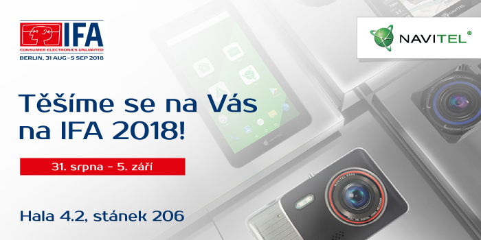 NAVITEL® se zúčastní mezinárodního veletrhu spotřební elektroniky IFA 2018, který se bude konat v Berlíně ve dnech 31. srpna až 5. září. Během výstavy představí společnost NAVITEL® své značkové elektronické zařízení – záznamové kamery do auta, GPS navigace, navigační tablety a hybridní řešení.