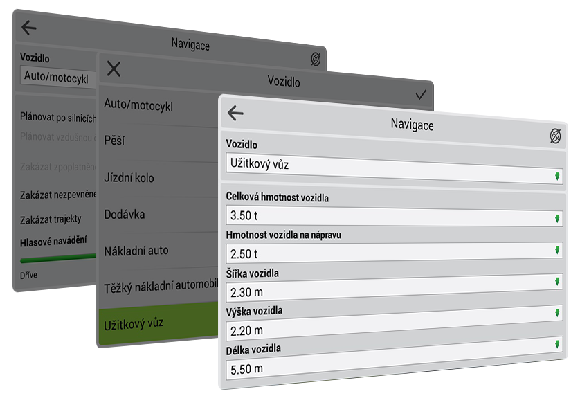 Všechny navigace Navitel mají funkci přednastavení parametrů vozu, takže jsou přímo ideální pro použití v nadrozměrných vozidlech a nákladních automobilech. Pomocí několika jednoduchých kroků můžete nastavit libovolné možnosti navigace, podle kterých zařízení automaticky vytvoří trasu vhodnou pro Váš dopravní prostředek.