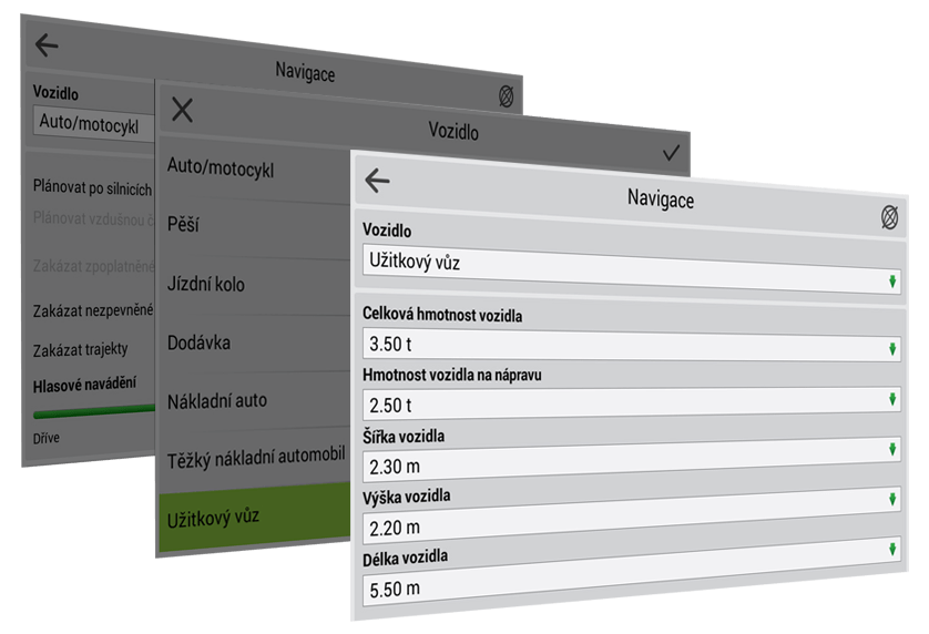 Pomocí několika jednoduchých kroků můžete nastavit libovolné možnosti navigace, podle kterých zařízení automaticky vytvoří trasu vhodnou pro Váš dopravní prostředek.