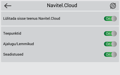 Kui sellist ikooni tööriistaribal pole siis võimalik, et see ei mahu kehtiva ekraani paigutuse tõttu sinna ära. Proovige ekraani paigutus ära muuta. Kui ikooni ei tekkinud, valige Menüü > Seaded > Kasutajaliides > Kaardi ikoonid, seejärel aktiveerige Navitel.Pilv ikooni kuvamine.