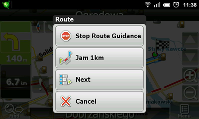 While driving on the route, to choose other path or circuit (for example, in case of closed road), user can make forced route replacement, clicking button “Jam 1km” in pop-up menu, which appears after click on next maneuver icon. There is no need for “Navitel.Traffic” service activation and Internet connection.