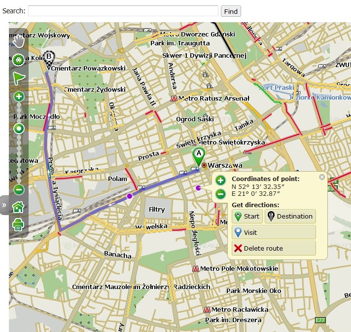 Online map user can make a route with any amount of intermediate points, taking into account traffic jams on all territory of Russia and other countries. Choose start and finish points on the map with right button of the mouse, if necessary — set intermediate points of the route.