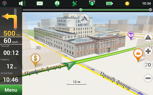 The map of Armenia includes 985 cities, towns and settlements and shows contours and locations of buildings. For Yerevan, the capital of Armenia, the map ensures full coverage of road network and contains a complete database of 25 200 addresses available for address search. The map represents 22 878 km of road graph, and a wide variety of 4 266 POIs will be at hand for search of objects, which might be necessary while moving along the route. The data is represented in Armenian, English and Russian.