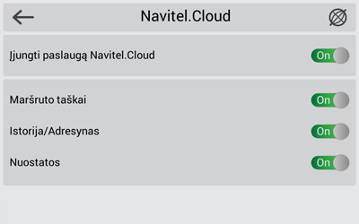 Jeigu tokio ženkliuko įrankių juostoje nėra, galimai jis netelpa dėl ekrano padėties. Jeigu ženkliuko vis vien nėra, pasirinkti Meniu > Nustatymai > Sąsaja > Ekrano mygtukai, įjungti mygtuko rodymą Navitel.Debesis. - Atsidariusiame dialogo lange Navitel.Debesis nuspausti Įjungti.