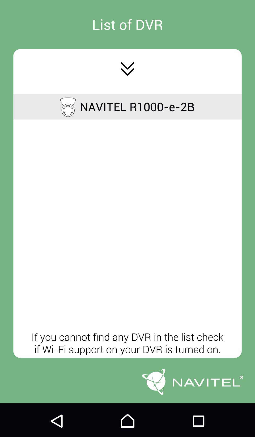 3. Pieslēdziet savu mobilo telefonu reģistratoram caur Wi-Fi savienojumu. Piekļūstamo tīkla sarakstā videoreģistrators būs atpazīstams kā NAVITEL r1000-e-XX. Pieslēdzot videoreģistratoru tīklam, izmantojiet paroli, kas norādīta sadaļā WiFi CARCAM.