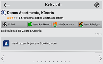 Booking.com vietne ir integrēta Navitel Navigator ierīcē. Tas ļauj veikt viesnīcas numuriņa rezervēšanu, neizejot ārā no programmas. Ja šī funkcija būs ieslēgta, Jūs varēsiet kartē redzēt viesnīcas, kurās ar Booking.com vietnes starpniecību var rezervēt numuriņu. Tās var apskatīt kartē vai atrast, izmantojot izvēles Tuvākā vieta funkcijas Atrast kategoriju Viesnīcas/Apmešanās vietas.