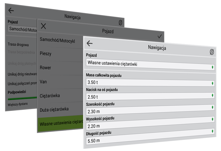 Oprogramowanie Navitel Navigator oferuje rozszerzony zestaw ustawień potrzebnych do nawigacji w transporcie towarów. Wybierz rodzaj transportu towarowego w ustawieniach lub stwórz własny pojazd dodając jego parametry: długość, szerokość, wysokość, maksymalną dopuszczalną i rzeczywistą masę, nacisk osi, itp. Program zbuduje trasę zgodnie z ograniczeniami dla tego typu ciężarówek, umożliwiając płynną jazdę do wyznaczonego celu.