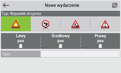 Ten rodzaj zdarzeń służy do oznaczania wypadków drogowych. Można użyć kolumny dodatkowych informacji i klawiszy skrótów do wyświetlenia pasa ruchu, na którym doszło do wypadku.
