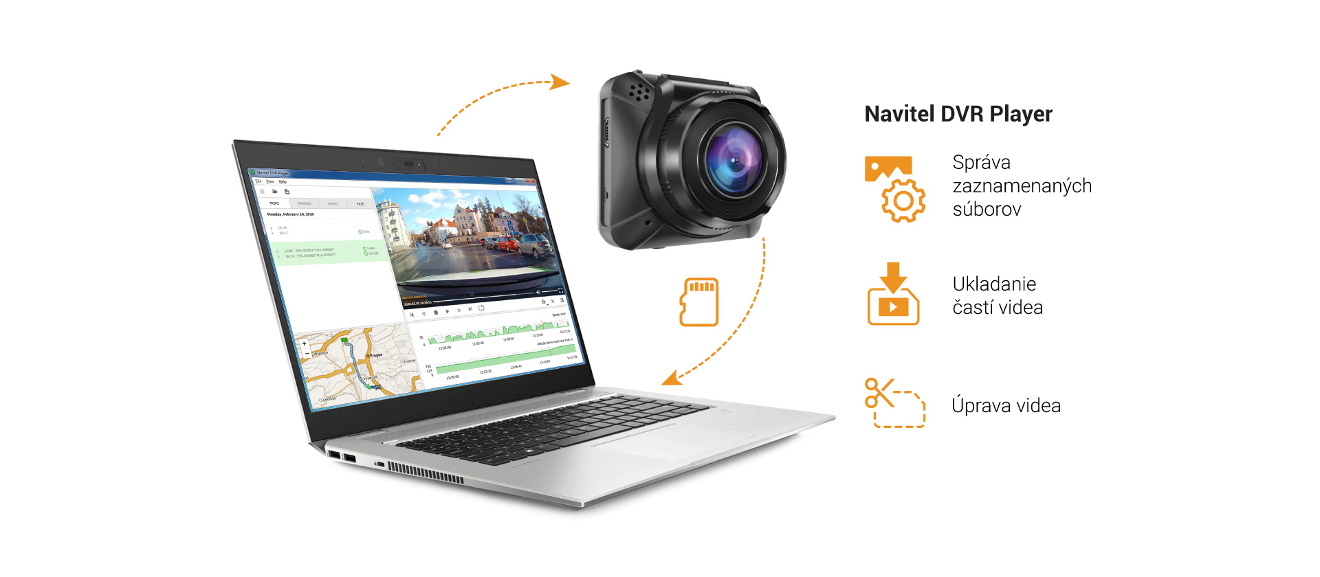 NAVITEL AR200 NV nahráva v rozlíšení Full HD pri rýchlosti 30 snímok za sekundu a používa jeden z najlepších formátov kompresie videa H.264. Všetky videá sú nahrávané v slučkovom režime na microSD kartu až do výšky 64 GB.