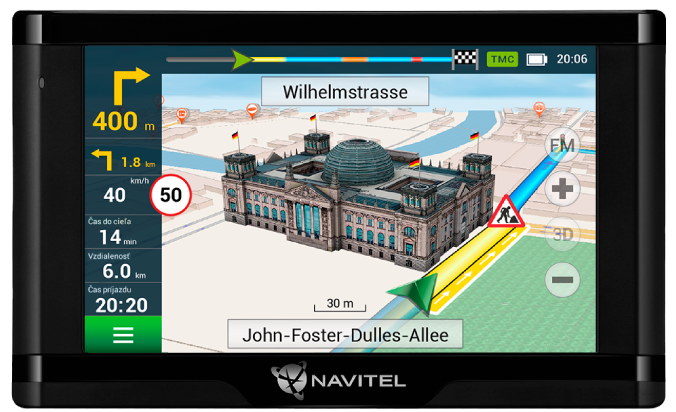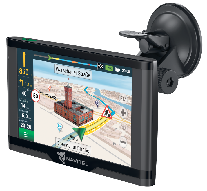 NAVITEL E500 MAGNETIC TMC je automobilová navigácia s podporou dopravných informácií (TMC – Traffic Messaging Channel technology). Vďaka tejto funkcii dostáva šofér informácie v reálnom čase o dopravných zápchach a nepriaznivých podmienkach, čo umožňuje vypočítať alternatívnu trasu, aby sa mohol vyhnúť problémovým oblastiam.