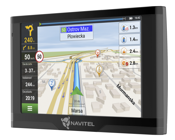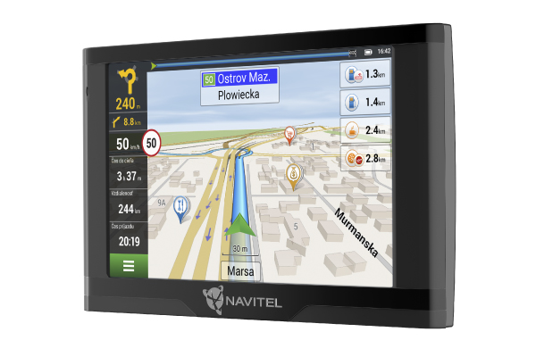Súčasťou zariadenia je licencia na mapy 47 krajín, z ktorých niektoré sú už v zariadení nahrané. Pomocou programu Navitel Navigator Update Center môžete aktualizovať zoznam máp, odstrániť nepoužívané, nainštalovať potrebné a tiež aktualizovať existujúce. Pre ukladanie aktualizácií máp a záznamov trás môže byť nutné nainštalovať SD kartu (nie je súčasťou balenia).